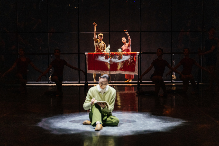 在精心构筑的倒叙时空里,舞剧开篇从中年“大姐”的回忆切入,通过交错的现实与记忆空间铺展青春叙事。跟随配音演员丁建华讲述的画外音,观众在一幅幅从1946年秋天走出的鲜活人物群像中,仿佛触摸到了历史的温度。舞台空间被回忆的潮水浸染,在战火中永远定格的面容逐渐浮现,巧妙的编排让现实与回忆在这一刻完成了转换。上海芭蕾舞团艺术总监辛丽丽表示:“《百合花》以海派芭蕾的独有风格赓续上海红色文脉,用国际视野下的创作弘扬城市精神品格,作品重现战争岁月年轻一代的青春、热血、信仰、梦想。”