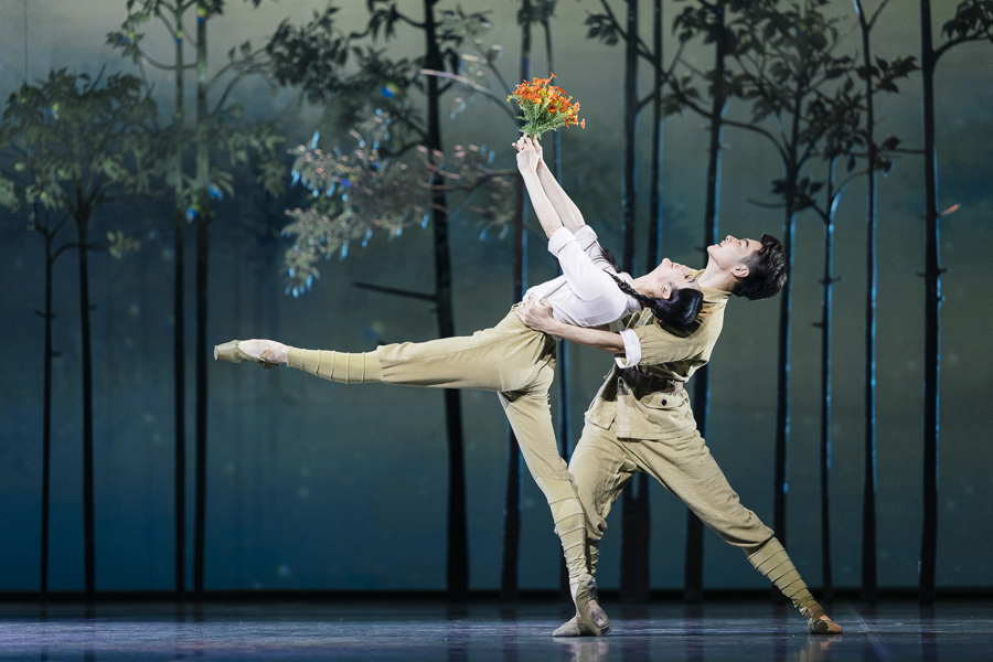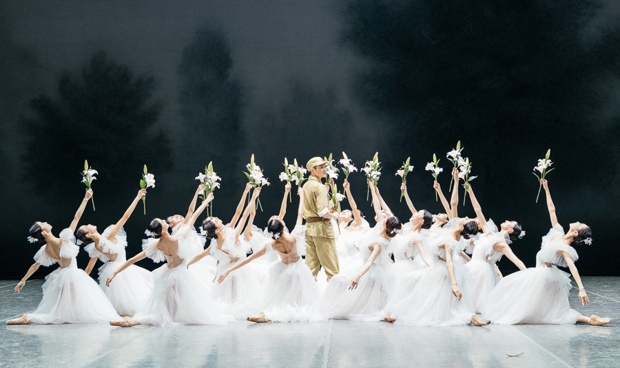 七月的风里,芬芳的百合花静静绽放。7月18日晚,原创芭蕾舞剧《百合花》在上海大剧院迎来首演,以细腻的肢体语言描摹文学作品中的丰富情感。首演现场,指挥张诚杰执棒,上海歌剧院交响乐团伴奏,营造丰沛的艺术感染力。战火中,“通讯员”为了保护运送伤员的担架队,扑在敌人投来的手榴弹上壮烈牺牲;月光下,“新媳妇”将未曾借出的婚被轻轻盖在他的身上,枣红被面上的百合花显得格外醒目;伴随着动人的音乐,“通讯员”的英魂回到家乡……不少观众被这一幕幕场景所打动,红了眼眶。